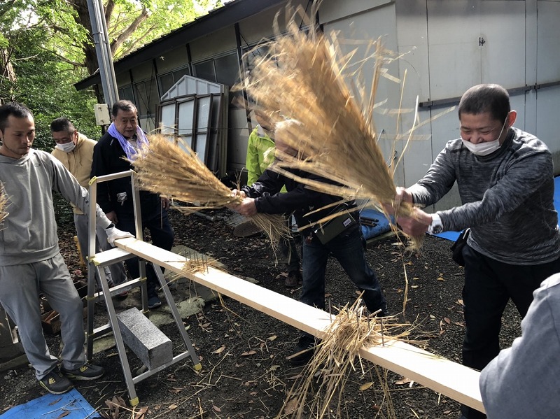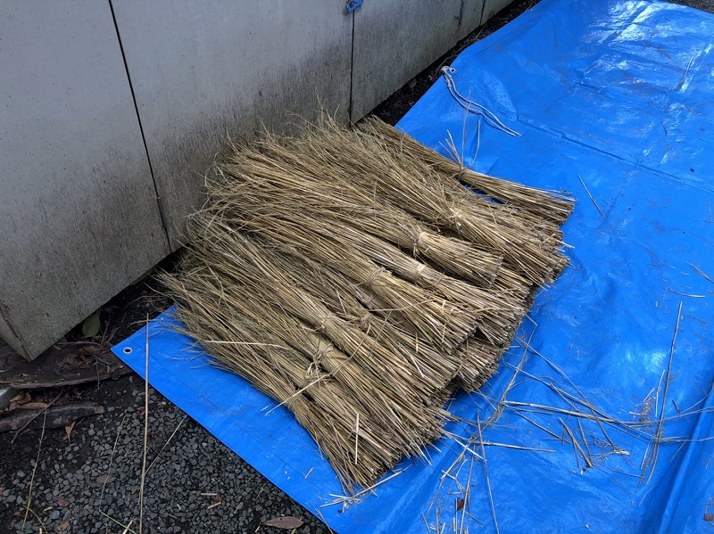 ▽9月にご奉納いただいてから、神社の裏手で乾燥させていた稲わらです。まだ刈り取って籾を取っただけのものなので、注連縄に使うにはハカマという余分な部分がついています。