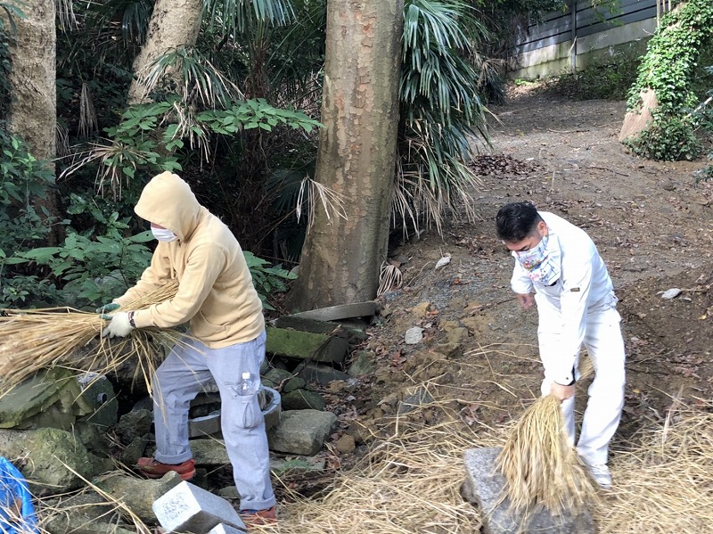 作業にあたっては、例年お正月の門松製作で稲わらの扱いに習熟されている、総代会長の山口さんにご指導頂きました。