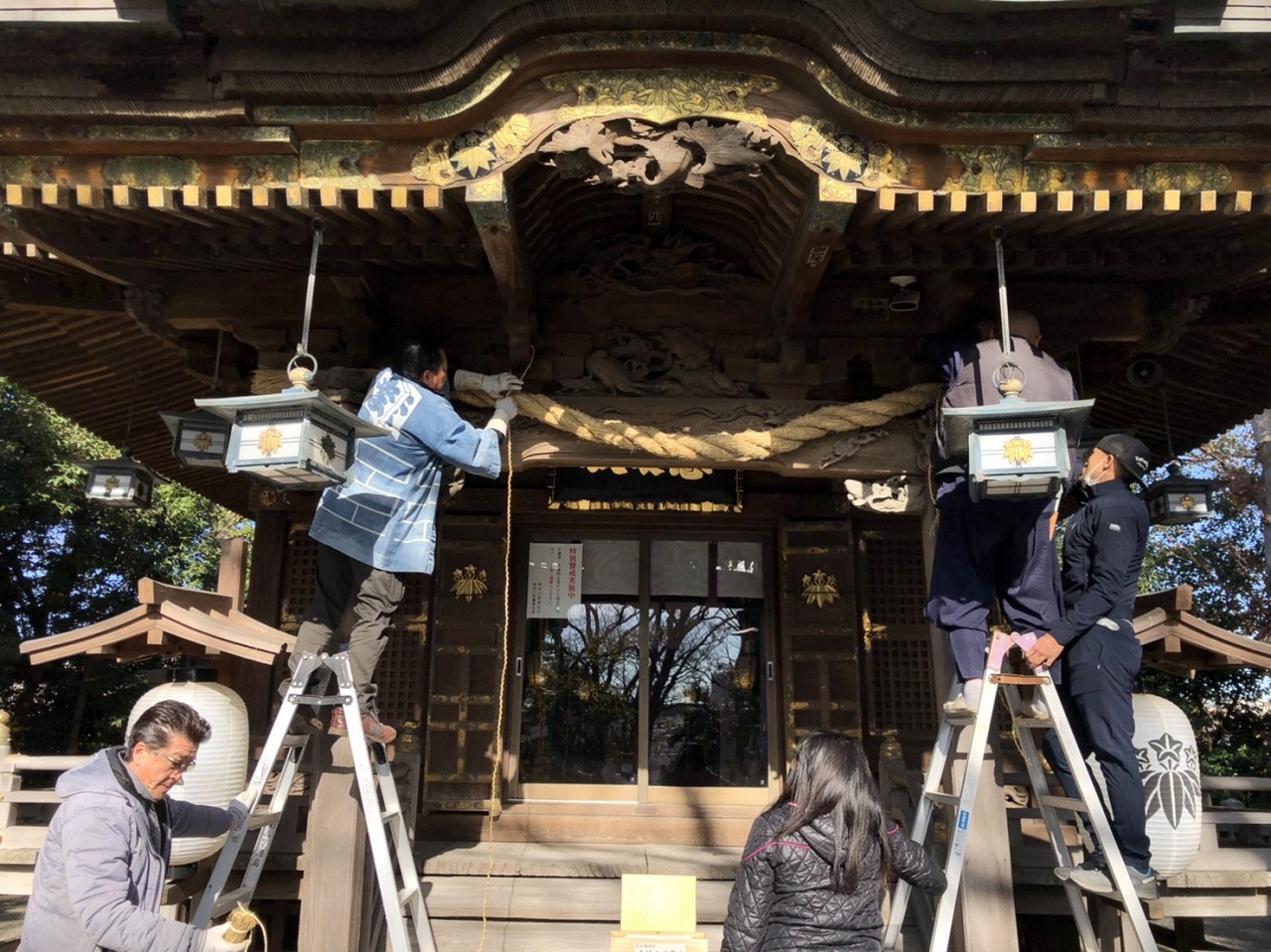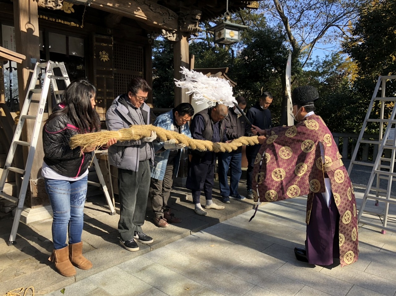 ▽社務所裏で保管していた注連縄を御社殿前に運びます。脚立も持っていくので案外人手が必要です。