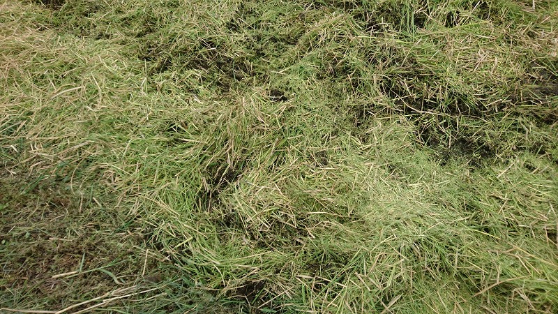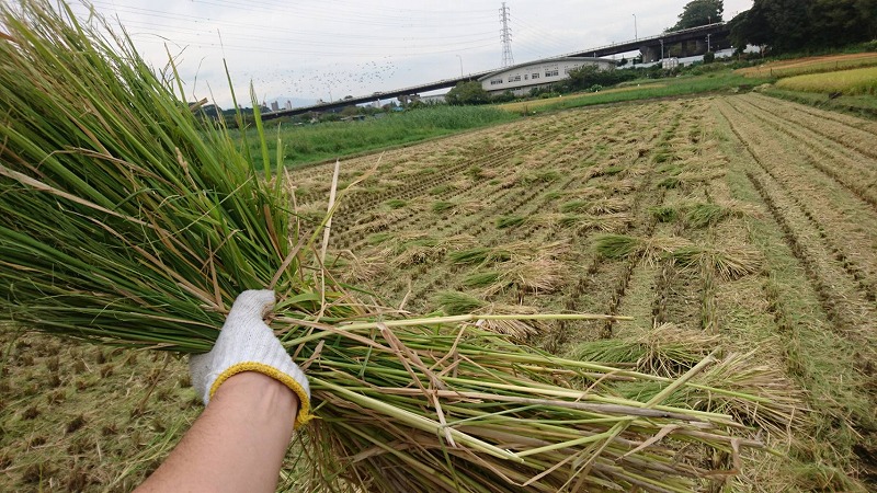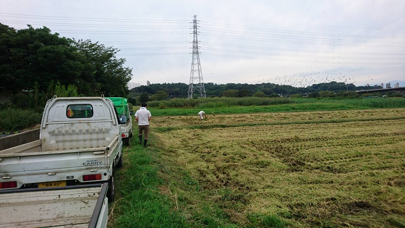 近年、稲刈りと同時に稲わらは粉砕され田んぼに撒かれているとのことで(肥料になる)、すでに一反は上記のような状態でしたが、我々のために隣の一反は藁をまとめて置いて下さっていました。