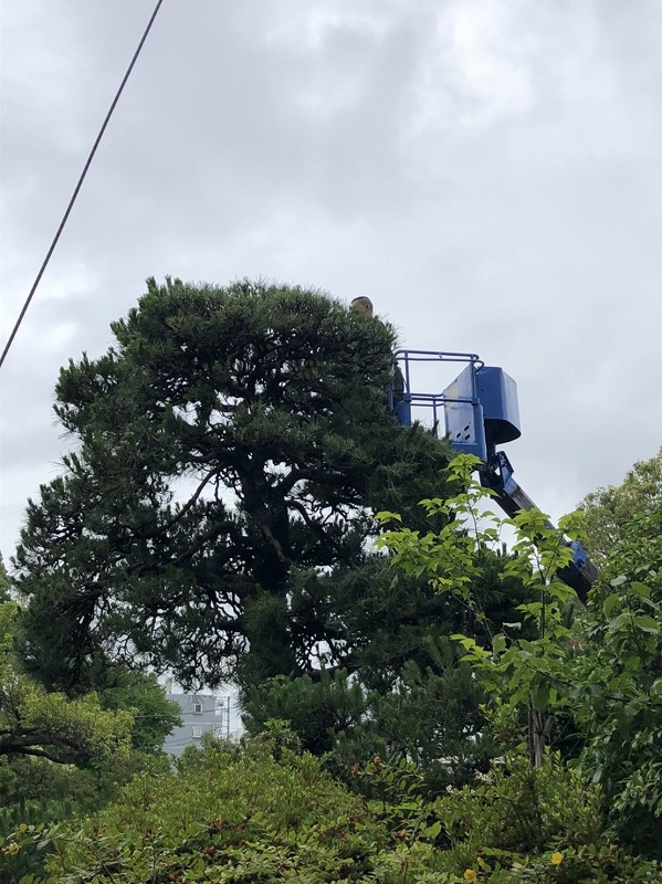 ▽弁慶松の手入れは、高い所は高所作業車を使って行っていただいております。私は高い所が苦手なので、見ているだけで背中がムズムズしてきます。