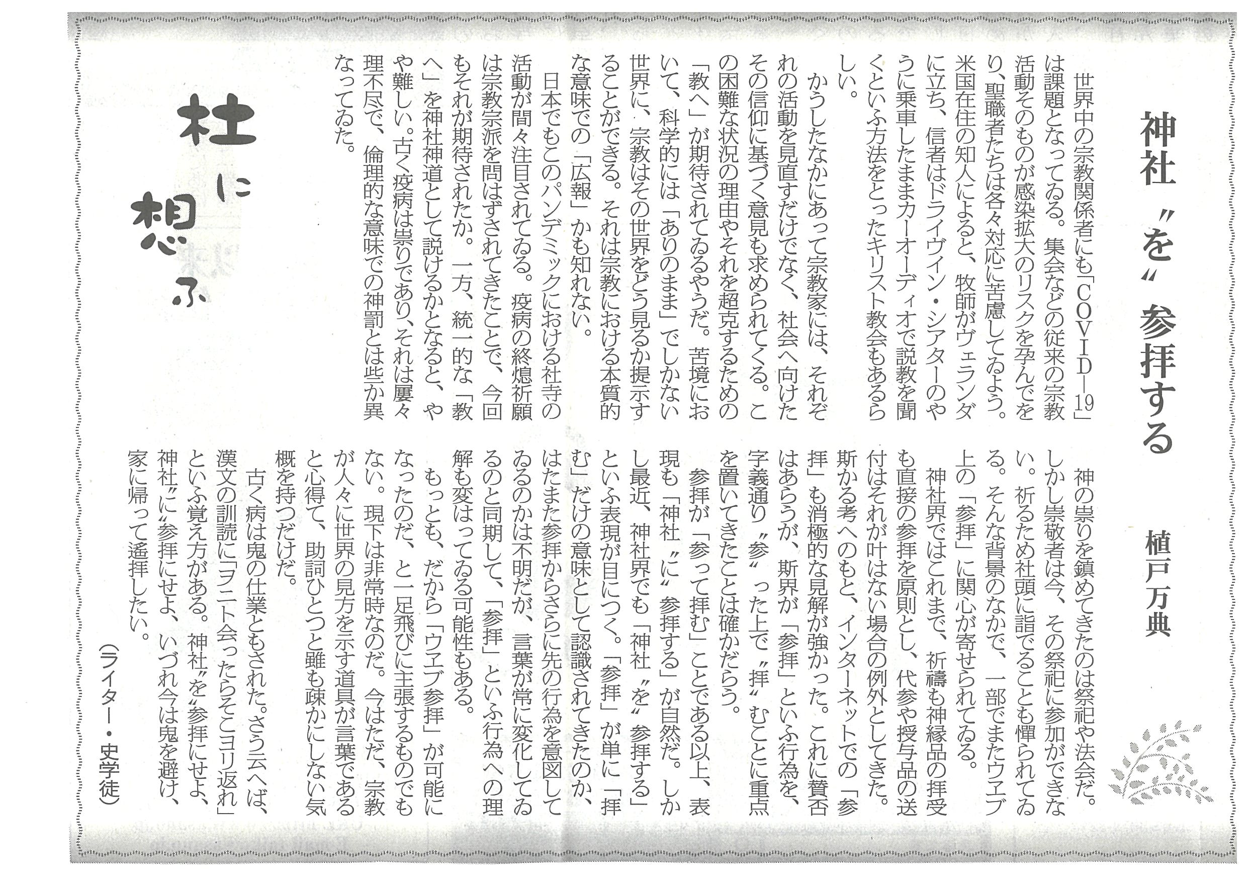 さて、神社界唯一の業界紙である『神社新報』令和2年4月27日号掲載のコラム「杜に想ふ」を御紹介致します。