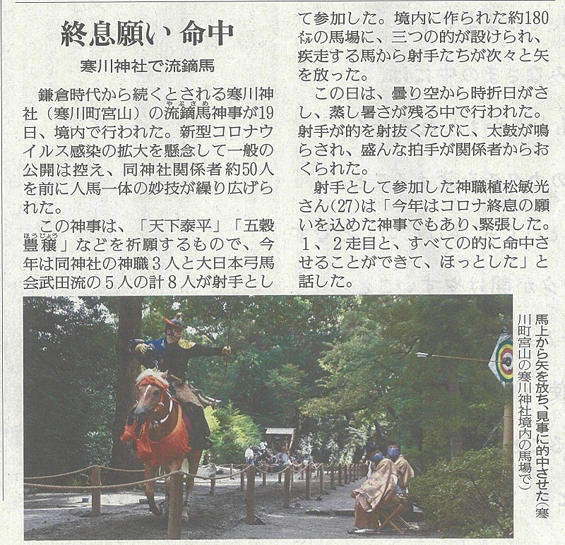 翌日20日付 読売新聞湘南版。写真は寒川神社神職が騎乗する平安号でした。
