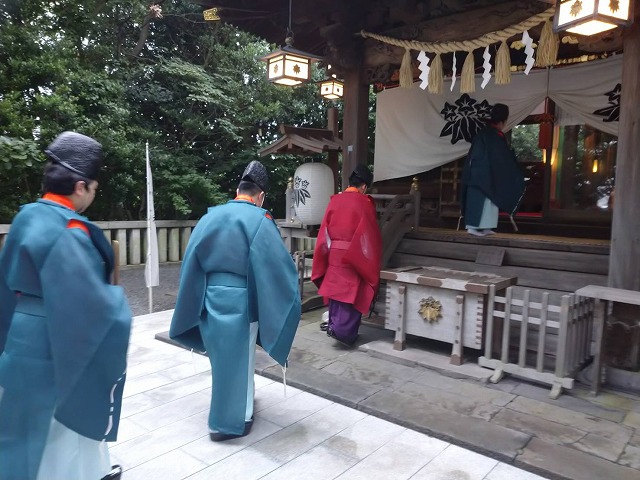 例年は氏子総代や神輿保存会の方々に参列して頂いて、ご一緒に奉仕して頂いておりましたが、コロナウイルス感染防止の為、神職と渡邊鳶頭とで行いました。