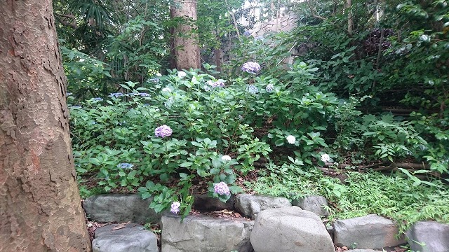 この写真は、平成26年2月の大雪の際の倒木により被害を受けた、石垣・玉垣の改修工事後にわいわい市場藤沢店で購入し植栽した紫陽花3株の様子です。